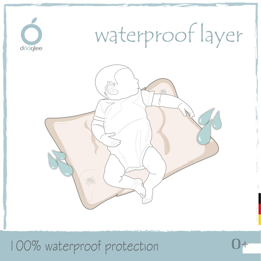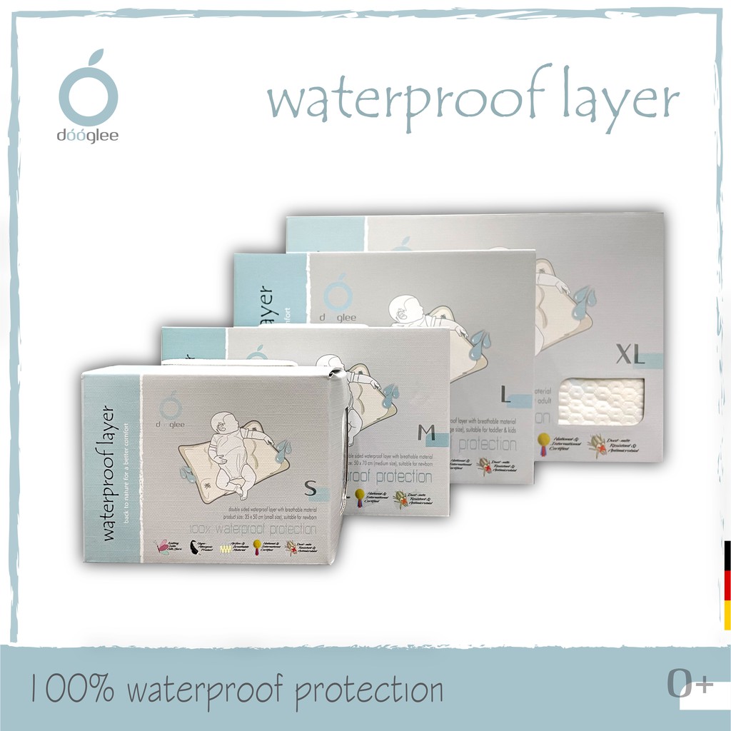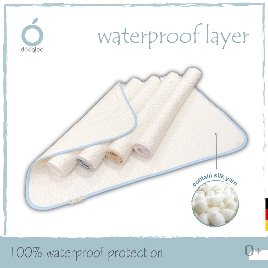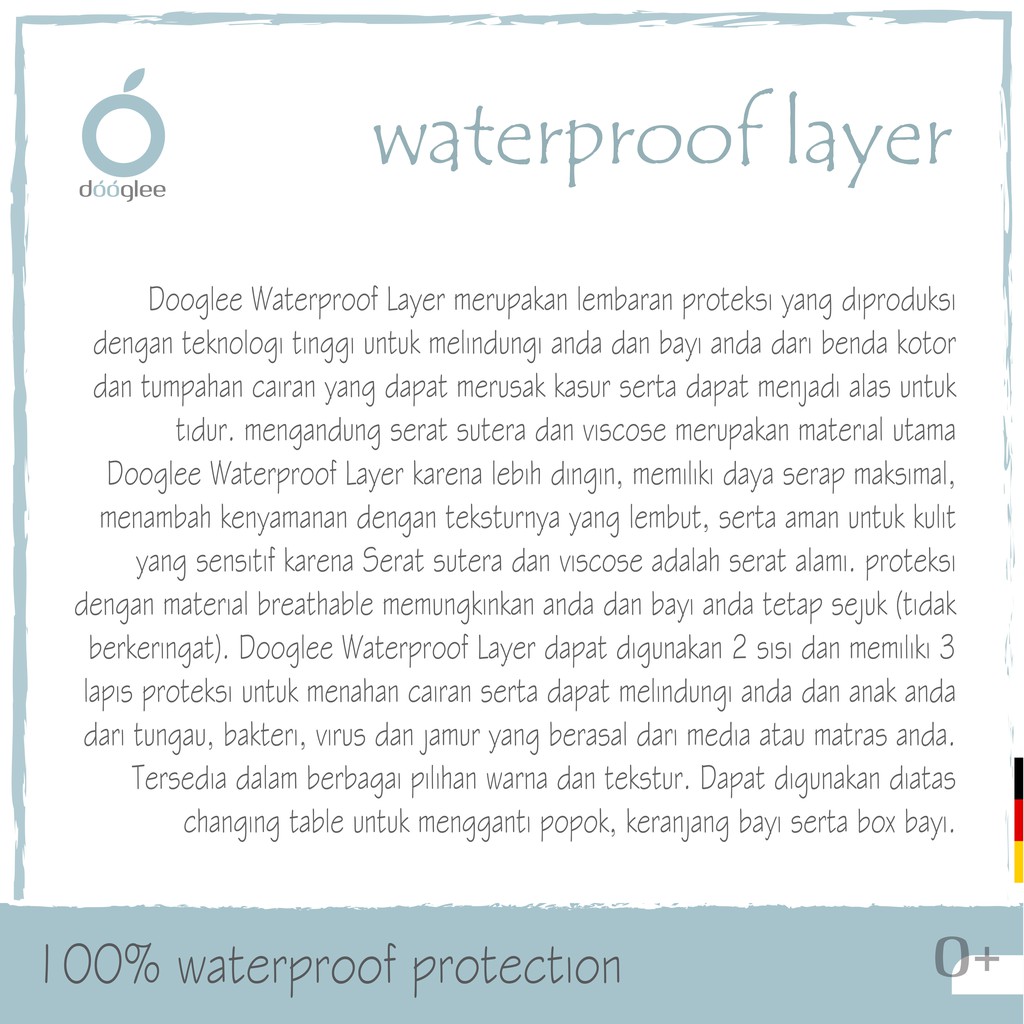 Dooglee Waterproof Layer merupakan lembaran proteksi yang diproduksi dengan teknologi tinggi untuk melindungi anda dan bayi anda dari benda kotor dan tumpahan cairan yang dapat merusak kasur serta dapat menjadi alas untuk tidur. Mengandung serat sutera dan viscose merupakan material utama Dooglee Waterproof Layer karena lebih dingin, memiliki daya serap maksimal, menambah kenyamanan dengan teksturnya yang lembut, serta aman untuk kulit yang sensitif karena Serat sutera dan viscose adalah serat alami. Proteksi dengan material breathable memungkinkan anda dan bayi anda tetap sejuk (tidak berkeringat). Dooglee Waterproof Layer dapat digunakan 2 sisi dan memiliki 3 lapis proteksi untuk menahan cairan serta dapat melindungi anda dan anak anda dari tungau, bakteri, virus dan jamur yang berasal dari media atau matras anda. Tersedia dalam berbagai pilihan warna dan tekstur. Dapat digunakan diatas changing table untuk mengganti popok, keranjang bayi serta box bayi.